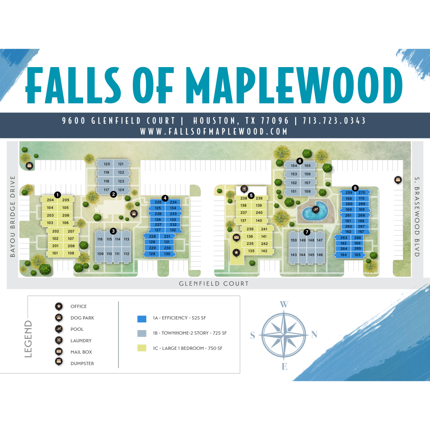 Welcome home to Falls of Maplewood apartments! Centrally located in Houston, Texas, giving you easy access to local restaurants, shopping, and entertainment, all within walking distance at Meyerland Plaza. You will appreciate the beautiful nearby parks and Brays Bayou for your enjoyment. If you are looking for a great apartment home to live a lifestyle of convenience, you have come to the right place.